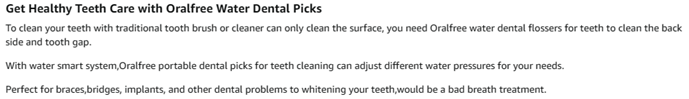 - 4 FLOSSING MODES POWER DENTAL FLOSSERS: Oralfree launch the newest portable water dental pick teeth cleaner items that was upgrade to 4 modes with Low-noise Design setting of water pressure to fulfilled your daily life use.Each mode provides you variety of using choice from standard mode, Please choose soft mode when you use dental flosser at the first time. Also helpful for bad breath, benefitful for bridge care