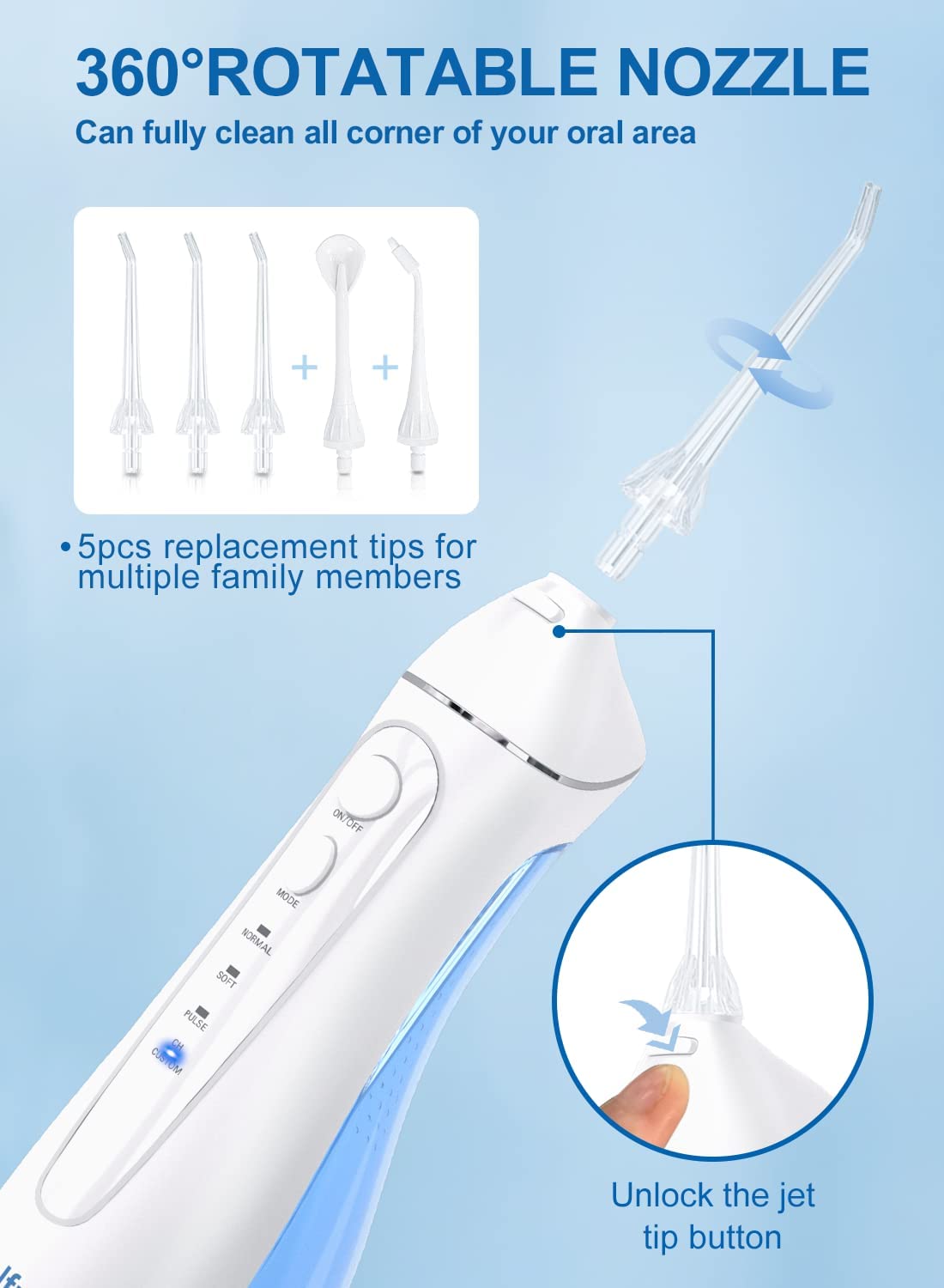- PORTABLE DESIGN FOR TRAVEL: This water teeth cleaner picks with 5 replacement jet tips for multiple family members that can rotate 360 degrees during use, to fulfilled your variety needs from standard clean to gum massage, suitable home, office, business trips or traveling use on the go