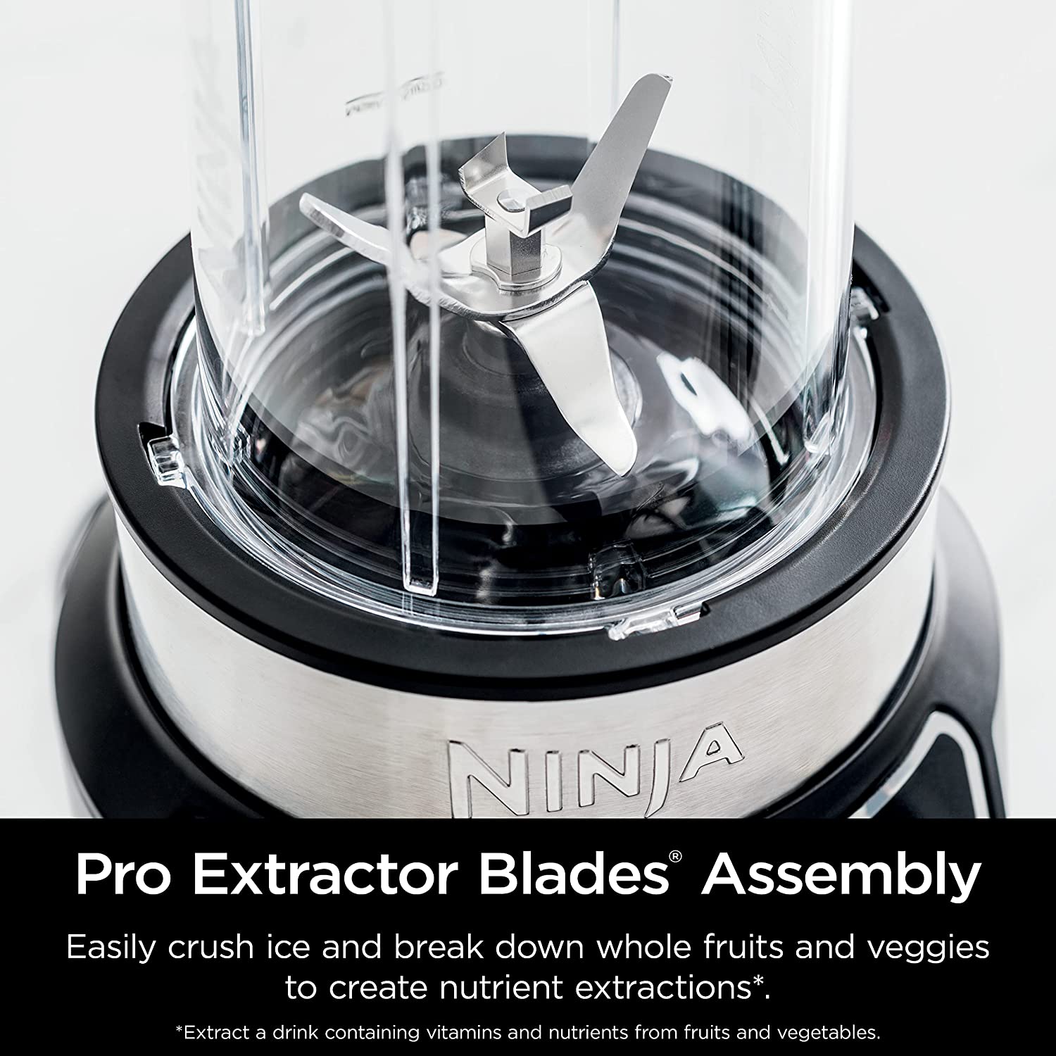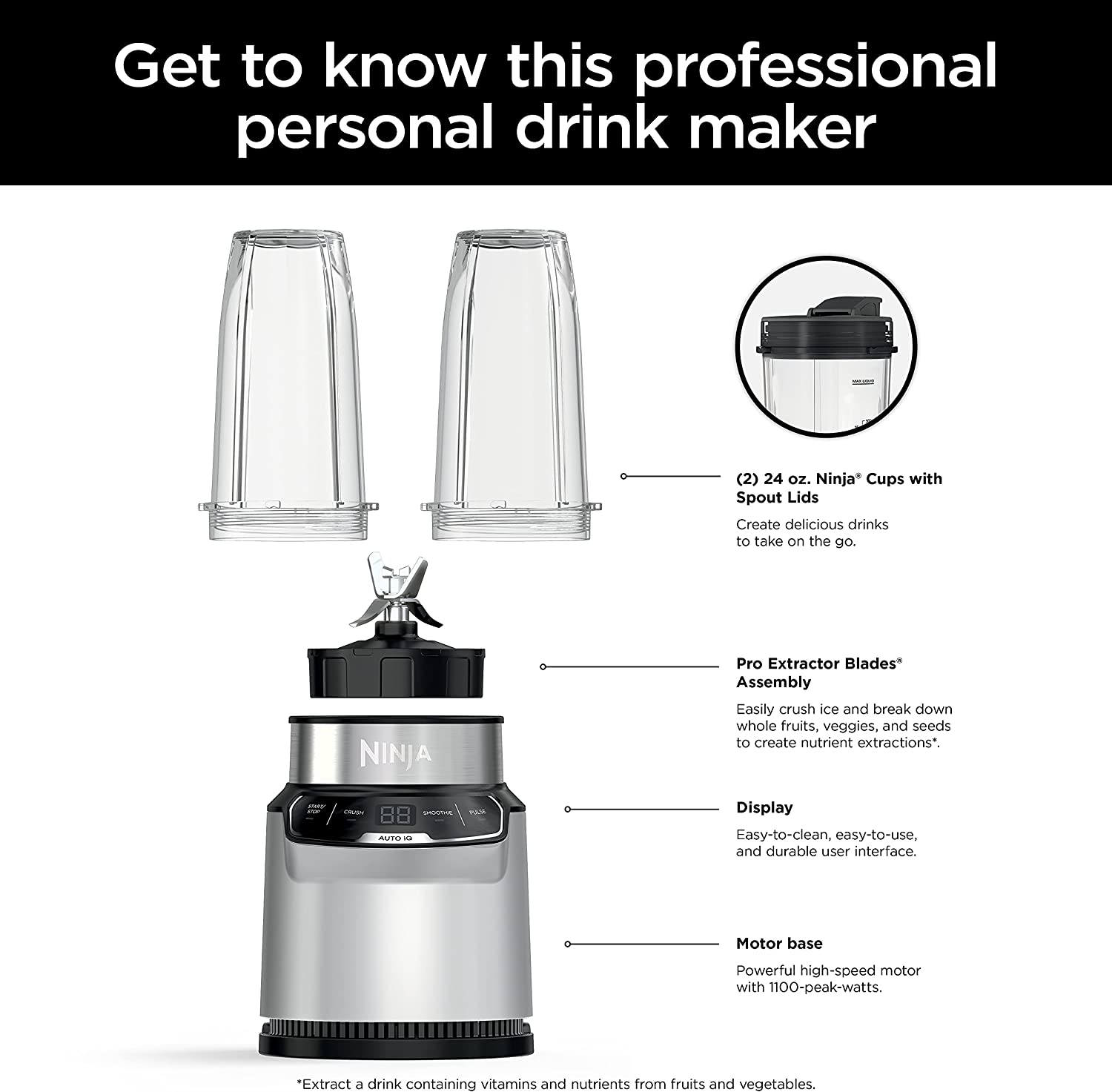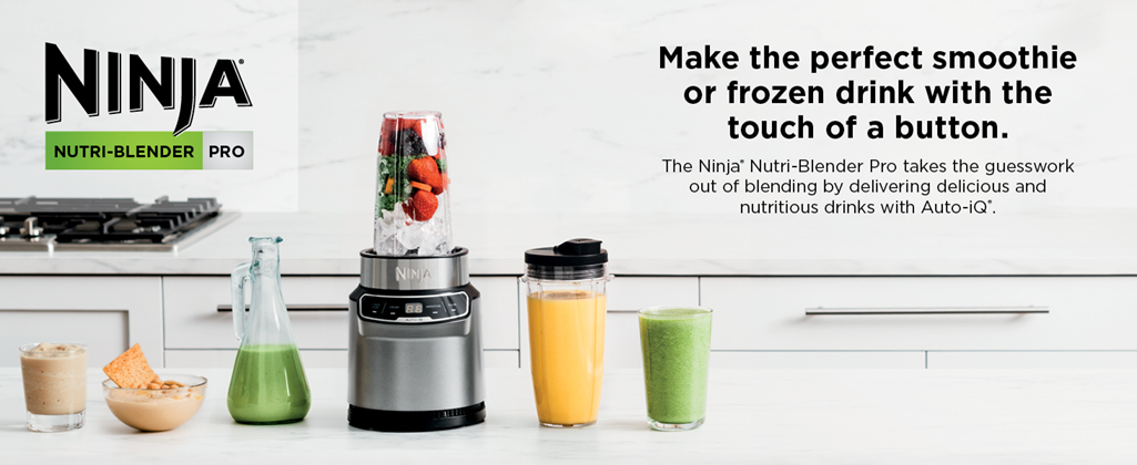 The Ninja Nutri-Blender Pro with Auto-iQ features a powerful 1100-peak-watt motor to pulverize tough ingredients. 2 preset Auto-iQ Programs combine unique pulsing, blending, and pausing patterns to take the guesswork out of blending. The Pro Extractor Blades Assembly breaks down fruits, vegetables, and ice. Blend in your Ninja Single-Serve Cup and use a spout lid to take your drink to go.