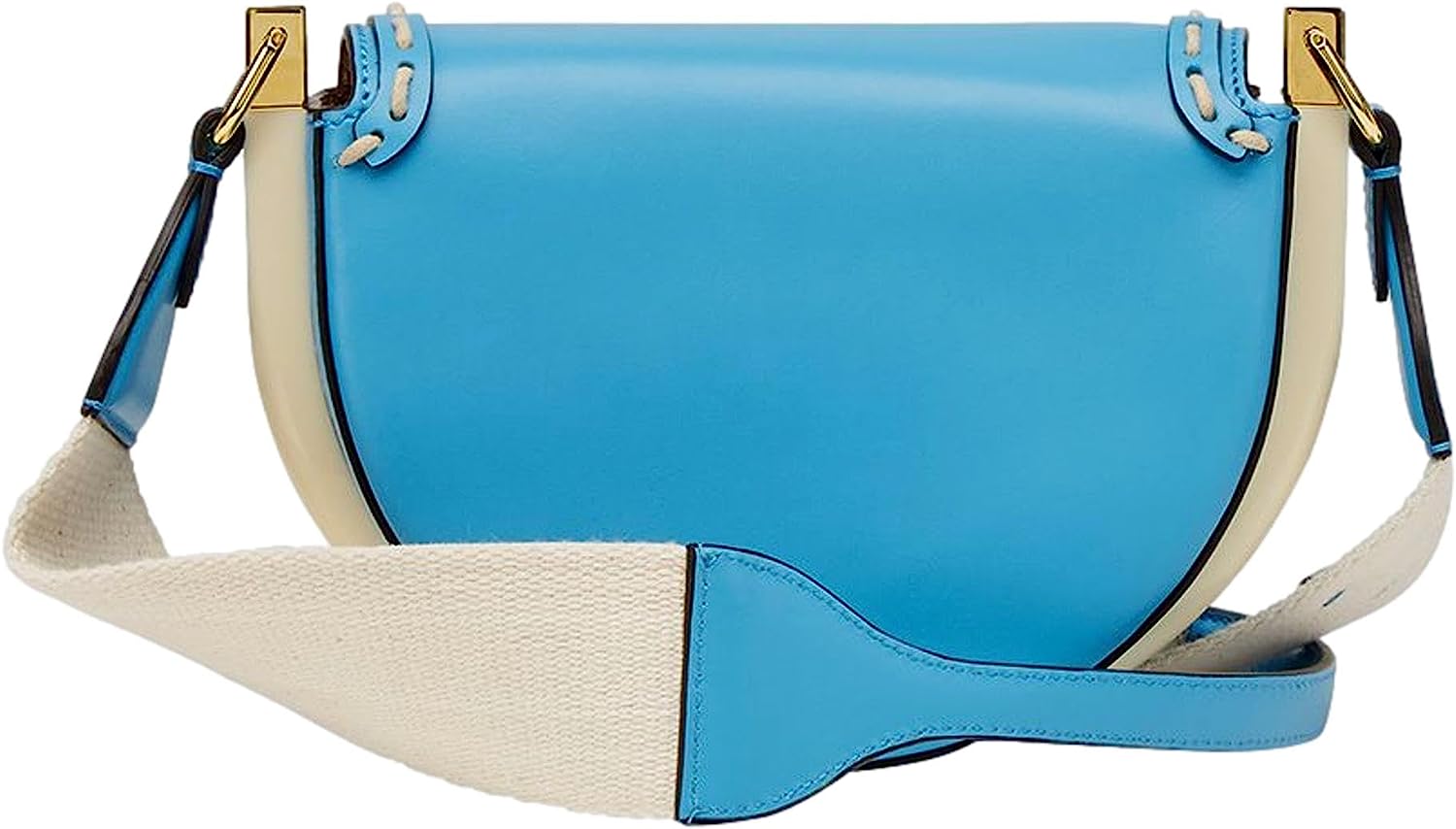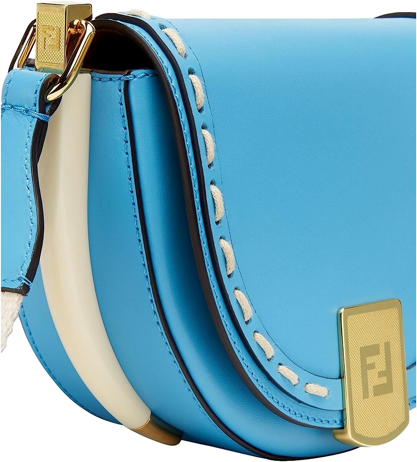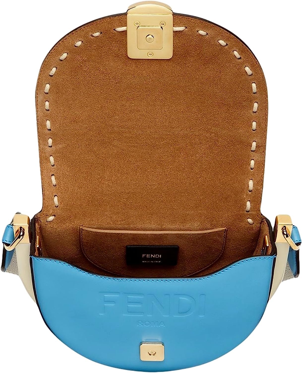 Cyber blue calfskin leather. Hand-stitched detailing. Ivory plexiglass framing. FF logo plaque. Inner debossed Fendi Roma logo. Gold-tone hardware. Snap closure. Tan suede. 1 interior slip pocket.